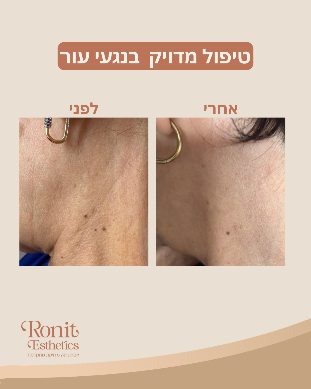 טיפול מקצועי להבהרת כתמי שמש ופיגמנטציה בעיקר בפנים ובכפות הידיים. כל טיפול מותאם אישית לעור שלך, במקצועיות ובדיוק גבוה, בשיטה מתקדמת - פלאזמה, כדי לשפר את מראה העור ולהעניק לו תחושת חלקות.